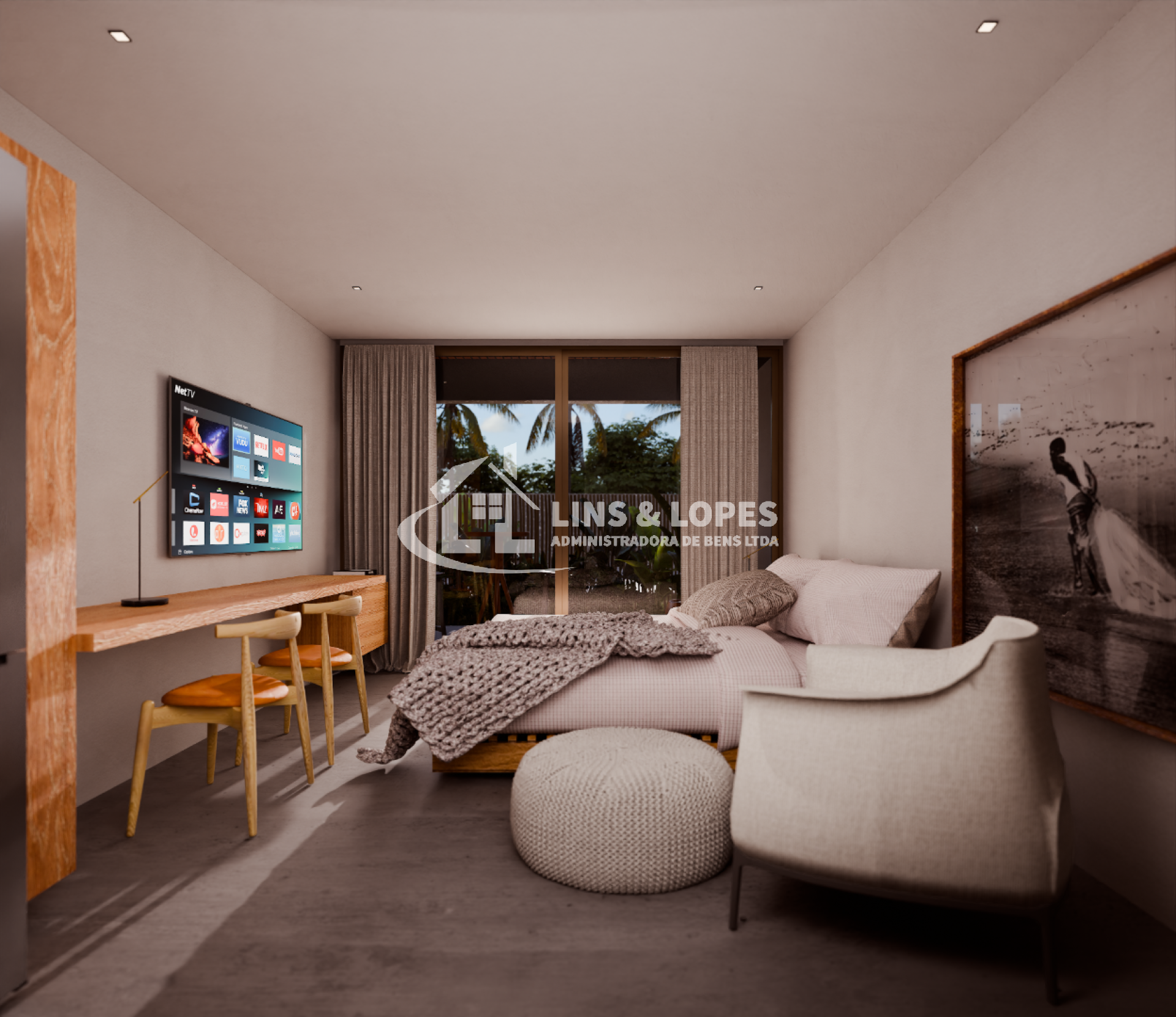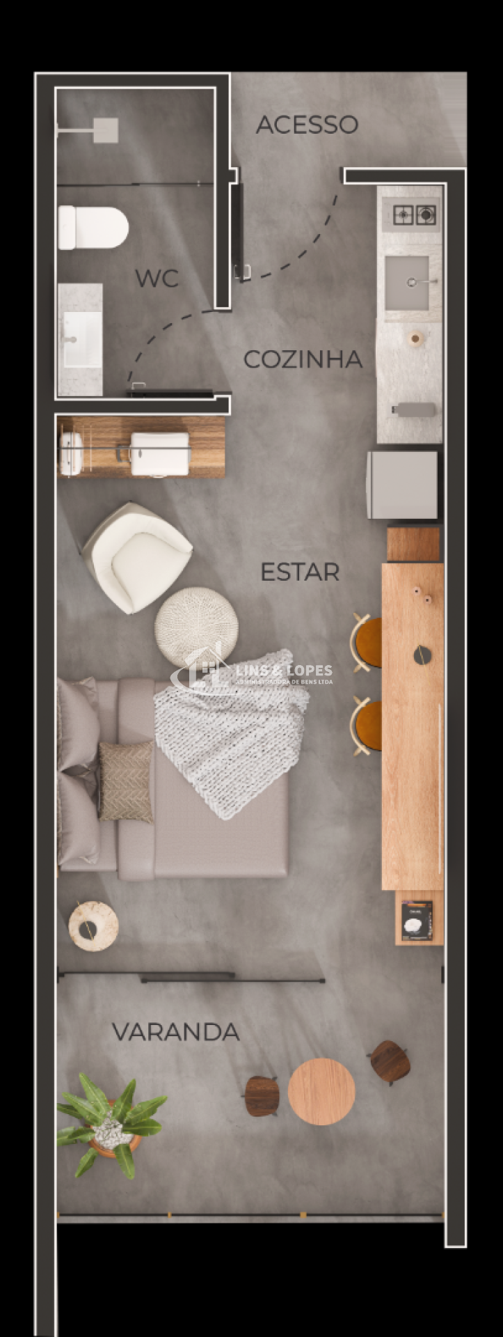 Studios modernos de 36,47m² + 9,20m² de área externa, perfeitos para investir ou relaxar com conforto e estilo.